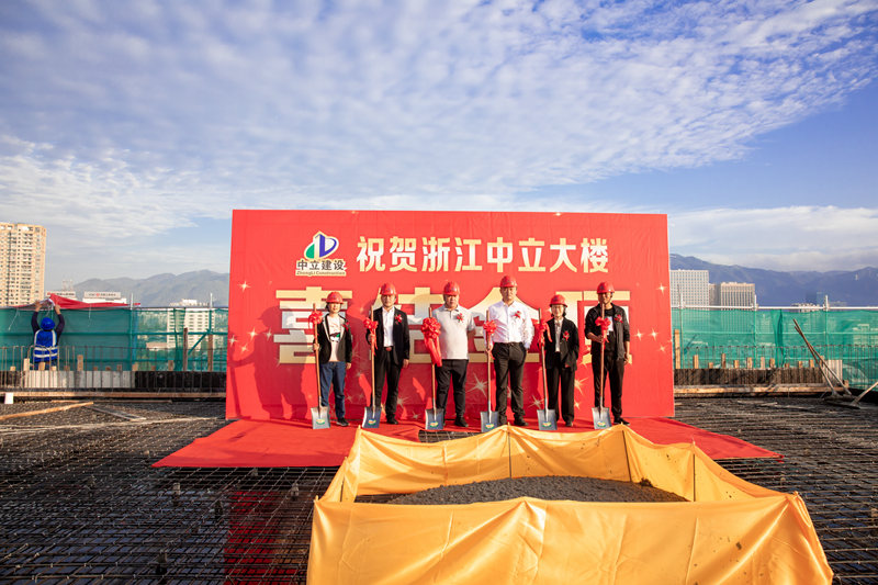 公司董事長周國強、副董事長周健、總經理鐘鳴、副總經理池甘萍、副總經理葉麗紅等人共同拿起鐵鍬,為中立大樓澆筑結頂,迎來了歷史性的時刻。